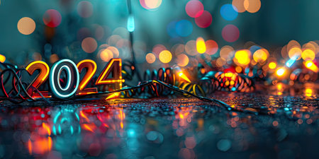 A vividly lit '2024' neon sign with a multicolored bokeh light effect.