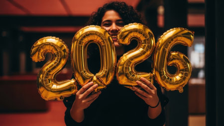 A person with dark curly hair holds up large shiny gold balloons forming the number 2026. The scene is warmly lit suggesting a festive party or New Years Eve celebration.