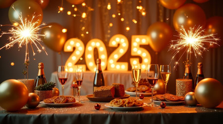 Festive dinner table is set for new year's eve 2025 with sparkling lights and golden balloons