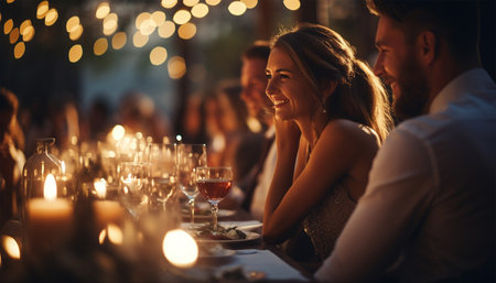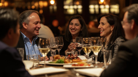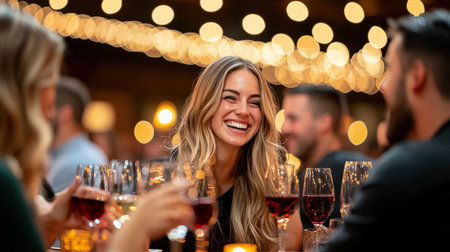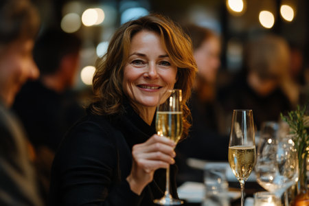 Amid a warm atmosphere filled with soft lights, a woman smiles while holding a glass of champagne, celebrating with friends at a formal dinner gathering in a charming restaurant.