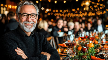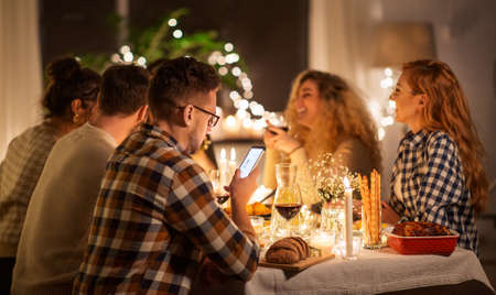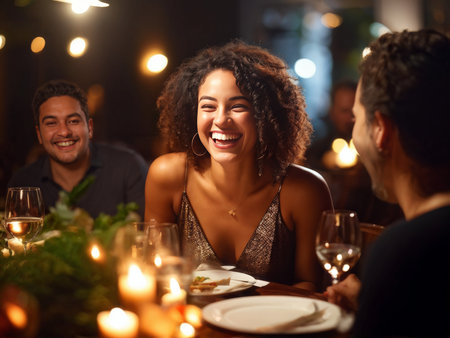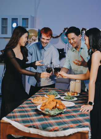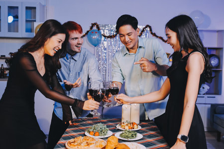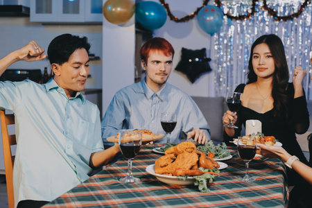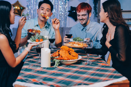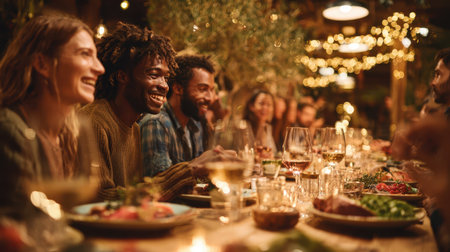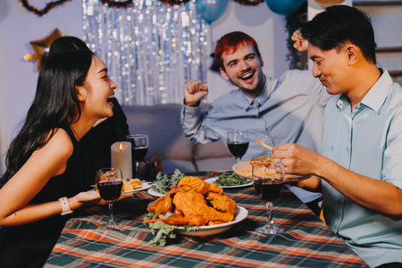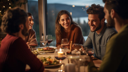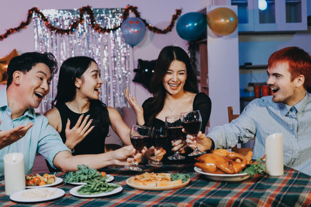 celebrations, festivals, and the idea of individuals. A joyous gathering of multi-ethnic friends at home for Christmas supper.