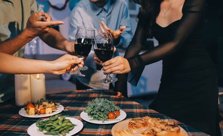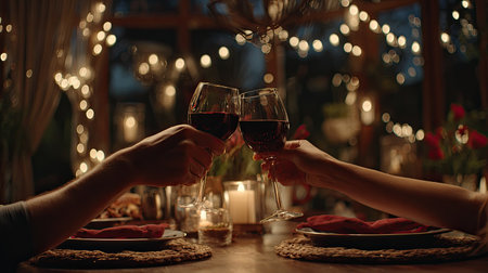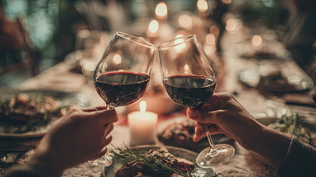 Two hands raise glasses of red wine in a celebratory toast. Warm lighting illuminates the scene of a dinner table setting with food, candles and blurred background. This image is suitable for various commercial uses, including advertisements, editorial features, and visual content.