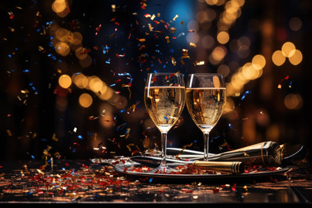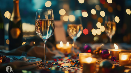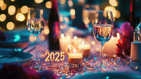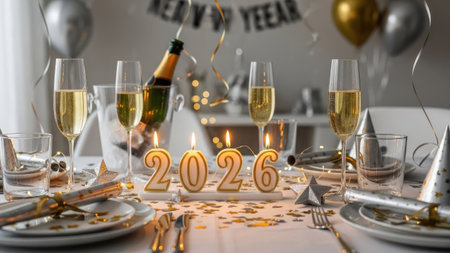 An table setting features champagne flutes and an inviting bottle, complemented by festive decorations. The scene includes lit candles displaying the year, sparkling confetti, and balloons, creating a celebratory atmosphere. This image is suitable for various commercial uses, including advertisements, editorial content, and website design related to holidays.