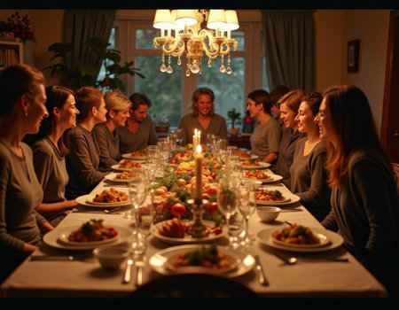 A warm dining room showcases a group of ten people seated around a long, festive dinner table. a glowing chandelier illuminates the space, and a central candle adds a cozy touch to the holiday gathering, emphasizing unity and celebration.