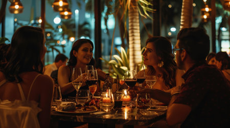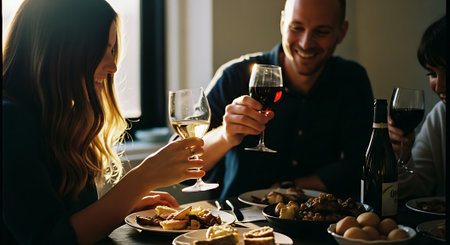 A group of friends enjoying lively dinner party with food, drinks, laughter, and warm lights