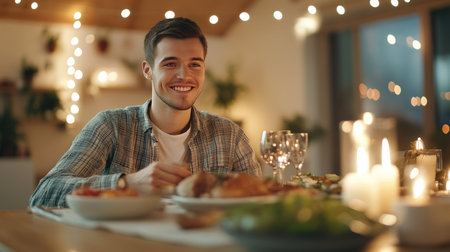 A handsome young man with a warm smile, dressed in a casual shirt, is seated at a beautifully set dinner table, looking content and happy.