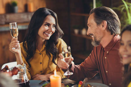 Portrait of family thanks giving meeting sit table greeting dinner young marriage parents communicating living room indoors
