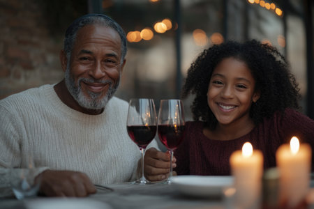 A joyful family dinner under ambient lights with a father and daughters enjoying a candlelit meal together outdoors at night. Generative AI