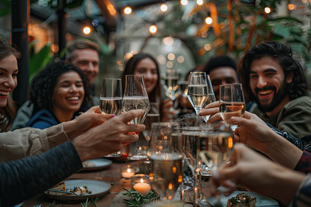 Group of friends celebrating together at a cozy evening gathering with sparkling glasses