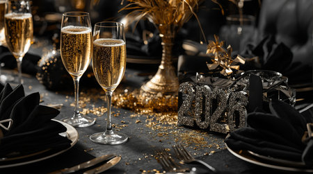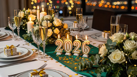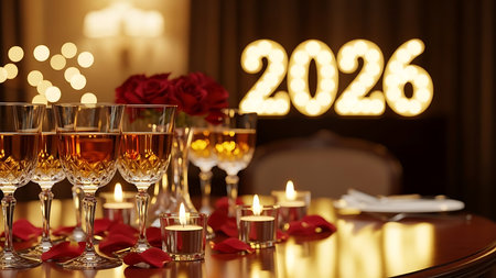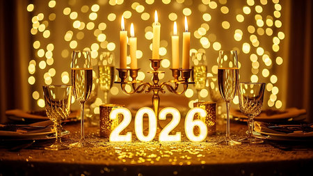 A luxurious and festive table setting for a New Year 2026 celebration, featuring sparkling champagne glasses, lit candles in a candelabra, glowing 2026 numbers, and a backdrop of golden bokeh lights. Perfect for holiday greetings, party invitations, or elegant event promotions.