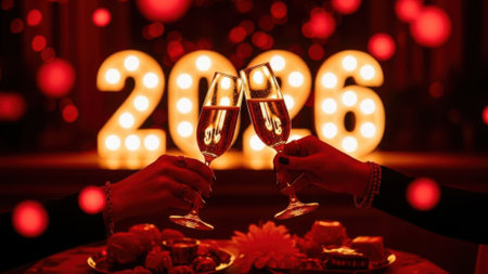 Close up of two hands clinking champagne flutes in a toast to celebrate the New Year 2026. Illuminated numbers and red bokeh lights create a festive party atmosphere.
