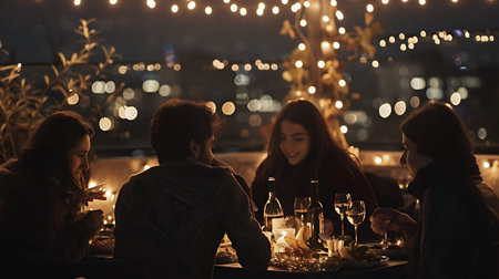 Group of friends having dinner on rooftop terrace at night. Selective focus