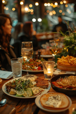 Dining table filled with various dishes and drinks, surrounded by warm lights and a lively ambiance, perfect for enjoying a memorable meal with friends
