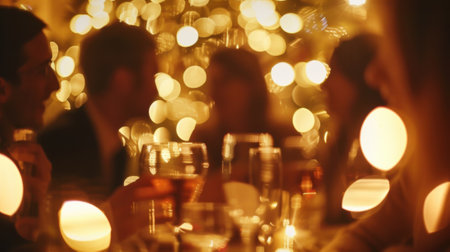 Faint blurred shapes of guests huddled together in merriment at the Christmas party
