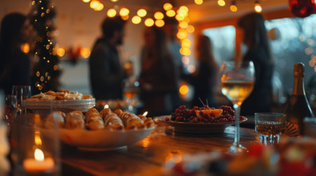 Softly blurred partygoers huddled around a table filled with delicious treats and drinks