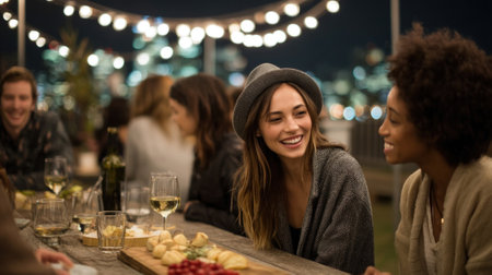 A nighttime rooftop gathering illuminated by fairy lights with young adults enjoying food drinks and good company while exchanging stories and laughter