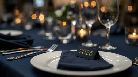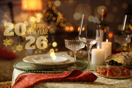 Happy New Year 2026 greeting card with festive table setting, bokeh lights