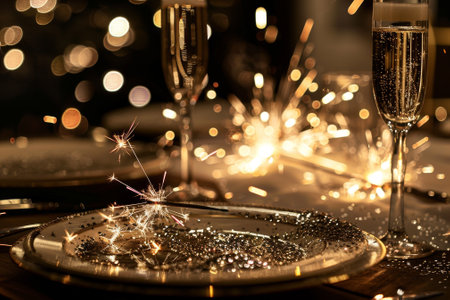 New Year's Eve table with a sparkling centerpiece, champagne, and a countdown clock. Party favors and festive decorations scattered around.