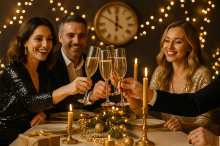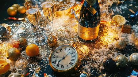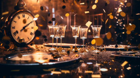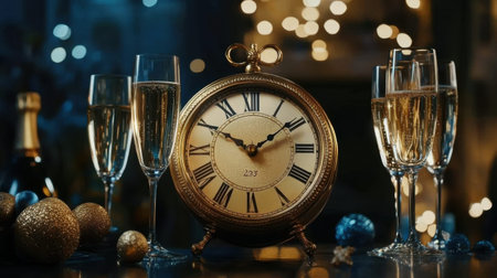 A warm and festive New Year celebration scene featuring a vintage clock, elegantly arranged champagne glasses, and shimmering decor, perfect for capturing holiday moments.