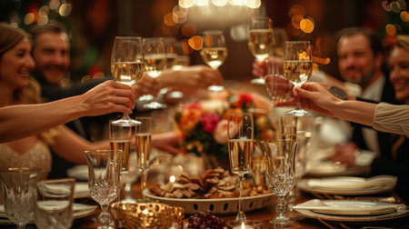 Friends raising wine glasses in a toast at a warm, festive dinner. Joyful celebration.