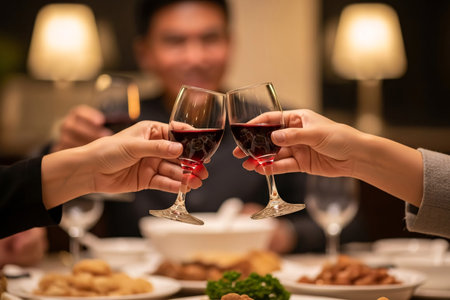 Toast with wine glasses during a Chinese Lunar New Year banquet symbolizing celebration and well wishes for the year.