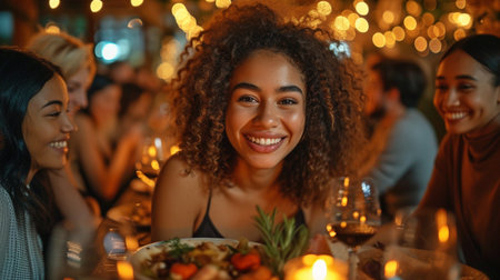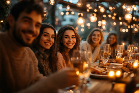 Group of friends smiling and enjoying Christmas dinner together under string lights, celebrating holidays