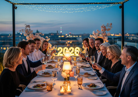 A sophisticated group enjoys a celebratory dinner on a rooftop, overlooking a vibrant cityscape at twilight. The table is beautifully set with fine dining elements and a 2026 centerpiece.