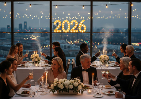An elegant New Years Eve dinner party with guests toasting in 2026, set against a backdrop of a vibrant city skyline and fireworks. Candles and floral arrangements enhance the festive atmosphere.