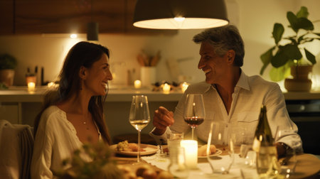 A couple shares an intimate dinner at home, surrounded by soft candlelight, as they smile, laugh, and savor their delicious meal together, creating a warm atmosphere.