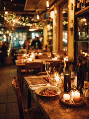 Romantic, atmospheric scene inside a rustic Italian restaurant or bistro at night, featuring a dining table set with candles, wine bottles, and food, surrounded by warm bokeh lights and a cozy glow.