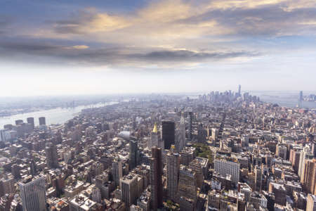 Aerial view of New York City Manhattan skyline at sunset, USA.