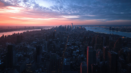 An expansive, high-angle aerial view of the New York City skyline as the sun begins to rise. The sky is painted with soft hues of pink, orange, and blue, casting a warm glow over the iconic skyscrapers. The city stretches out towards the horizon, with bridges spanning the water and the vast urban landscape illuminated by the early morning light. The captures the immense scale and energy of the metropolis, showcasing its architectural marvels and the dynamic interplay of light and shadow.