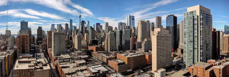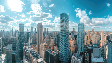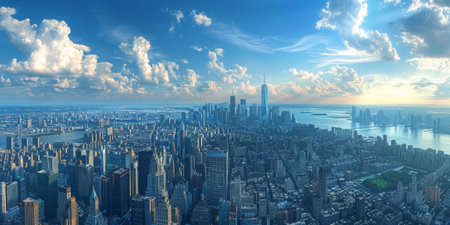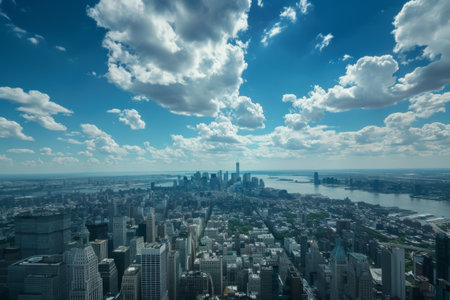 Breathtaking aerial view of a sprawling metropolis with towering skyscrapers reaching for a vibrant blue sky dotted with fluffy white clouds. Ai generated image