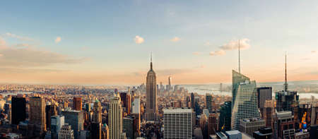 New York City Manhattan skyline panorama at sunset with skyscrapers.