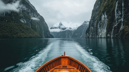 Immerse yourself in the tranquility of this boat journey through stunning mountains and clear waters. Experience the beauty of nature in a serene landscape.