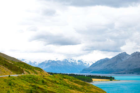 Mountains, lakes and meadow landscape in cold climate country with snow and cloudy weather on the mountains. The landscape was shot in Mt Cook, New Zealand, famous place for trekking and outdoors.
