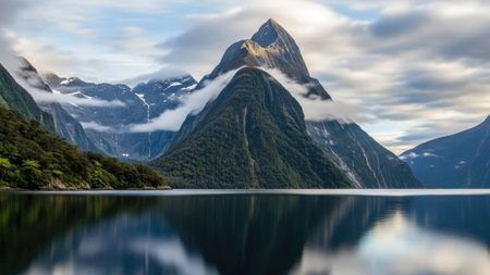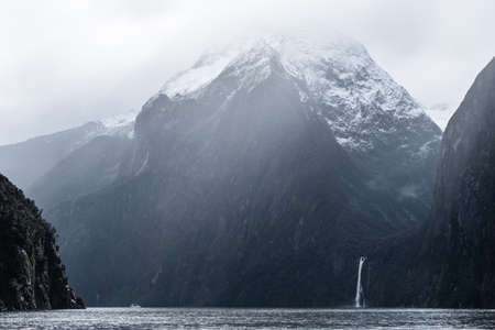 A stunning scene of nature with snow mountain and waterfalls at Milford Sound, New Zealand.
