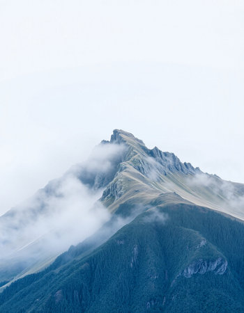 A dramatic and moody landscape view of a majestic mountain peak shrouded in mist, seen through a natural frame of dark, silhouetted trees and foliage over calm water.
