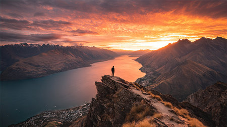 Man standing on top of a mountain and looking at Lake Wakatipu, Queenstown, New Zealand