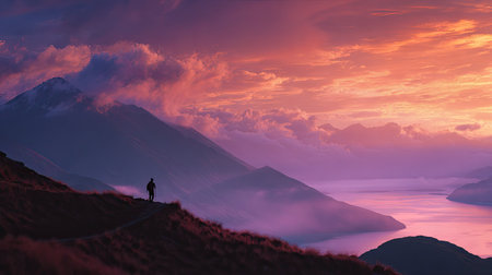 Man hiking in the mountains at sunset. Panoramic view.