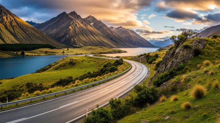 A road trip through the scenic landscapes of New Zealand. . --ar 16:7 Job ID: dfd18bf8-086d-4d2c-a994-53940c48905e