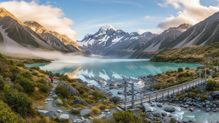 Hooker Valley, New Zealand. The concept of active, ecological and photo tourism