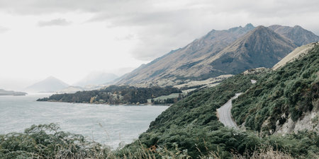Landscape of a mountain lake, roads, mountains. Road along Lake Wakatipu, Queenstown, New Zealand.