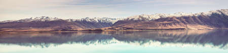 Natural landscape of New Zealand alps and lake. Reflection in water