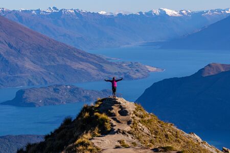 Traveler hiking in Roys Peak. New Zealand. Lake Wanaka