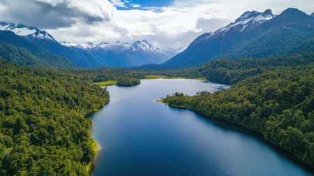 Experience the breathtaking beauty of an aerial view showcasing a tranquil lake bordered by dense forests and towering mountains under a brilliant sky.