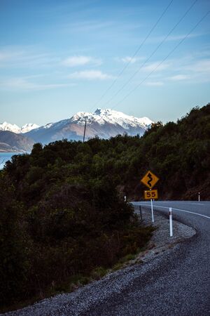 Beautiful panorama of the road towards Glenorchy with a traffic sign in the foreground and the snowy mountain in the background taken on a winter day in Queenstown, New Zealand