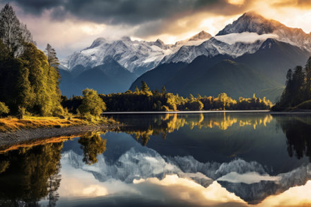 Natural landscape of New Zealand alps and lake with reflection in water