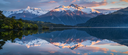 A tranquil sunset casting a soft alpine glow on a majestic mountain range, with reflections spreading across the still waters of a highland lake