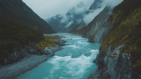 Turquoise waters rush through a deep river valley surrounded by steep mountains covered in greenery. Clouds hover above, adding to the dramatic atmosphere of this New Zealand landscape.